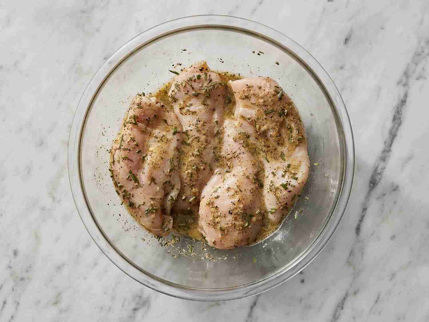 - Step 3:Add chicken breasts to bowl with lemon juice mixture and toss to coat completely, using your hands to gently massage lemon juice mixture into each chicken breast. Cover bowl with plastic wrap and refrigerate for 1 hour. Dotdash Meredith Food Studios